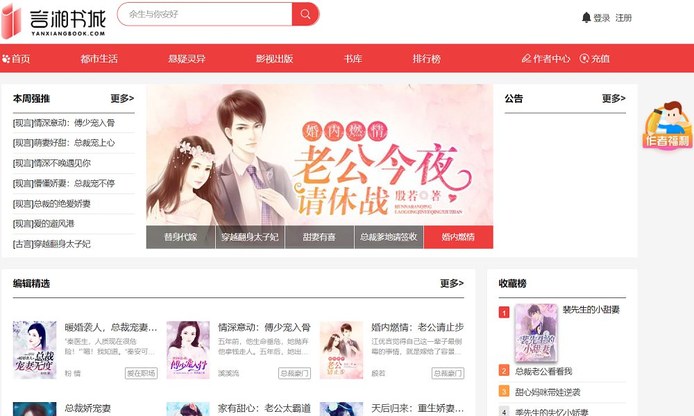言湘书城 推广置顶推荐言湘书城隶属于杭州悠书科技有限公司。其成立于2018年3月,是新成立的原创小说网站,至今旗下已收纳100余位优秀作者,作者福利丰厚,渠道给力,后台书库数量至今已达8000余本,基本囊括全网的女频爆款热销书,资源极其丰富,企业发展前景可观,是具有一定潜力的未来新势力小说网站。